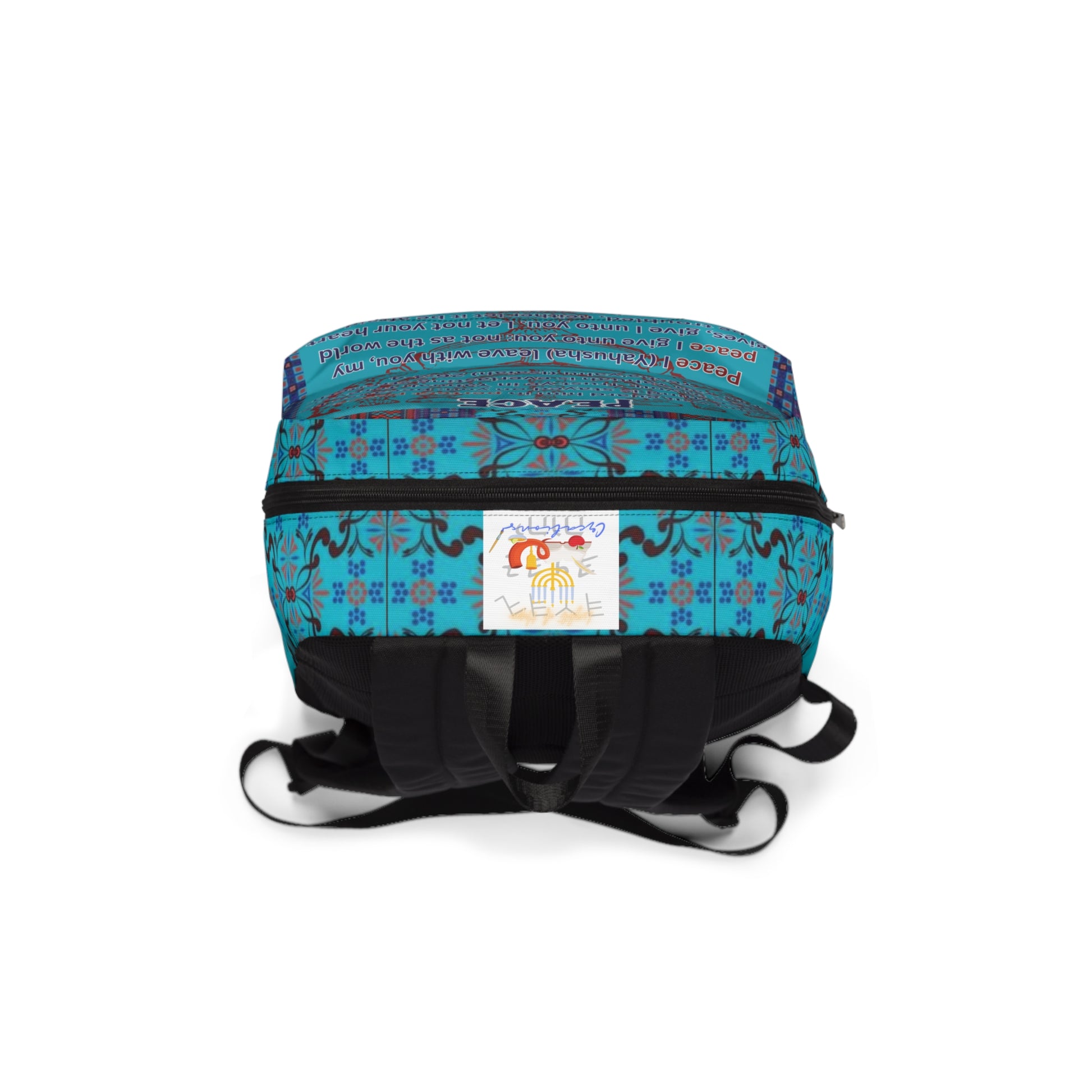 This stylish unisex classic backpack is designed for the modern adventurer. It has a beautiful turquoise African Kente cloth pattern, with various scriptures concerning Peace in the front, the Light of Hope Creations logo at the top,  and the Continent of Africa/Alkebulan along with the Paleo Hebrew name of Yahuah (who the world mistakenly calls God/The Lord) and Yahusha (who the world mistakenly calls Jesus) inscription on the sides. With its unique and vibrant patterns, it not only serves as a practical accessory but also makes a bold fashion statement. The lightweight and waterproof material ensures that all your essentials remain safe and dry, whether you're heading to school, a day trip, or a casual outing with friends. Ideal for students, travelers, and those who appreciate both comfort and style, this backpack adds a splash of personality to any outfit. Perfect for back-to-school season, holidays, and casual celebrations, this bag is a must-have for anyone looking to express themselves while staying organized.
